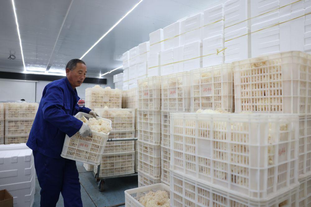 工作人员搬运等待采收的绣球菌。新华社记者 岳文婷 摄
