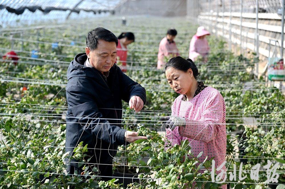 2月2日,衡水市冀州区西午村,李军(左)在大棚里查看蓝莓长势。河北日报记者 焦磊 摄