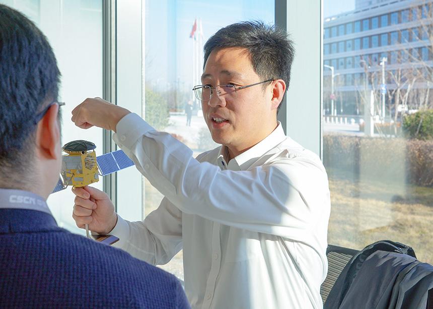 李鹏云手持航天模型和同事进行讨论。范瑞琪 摄