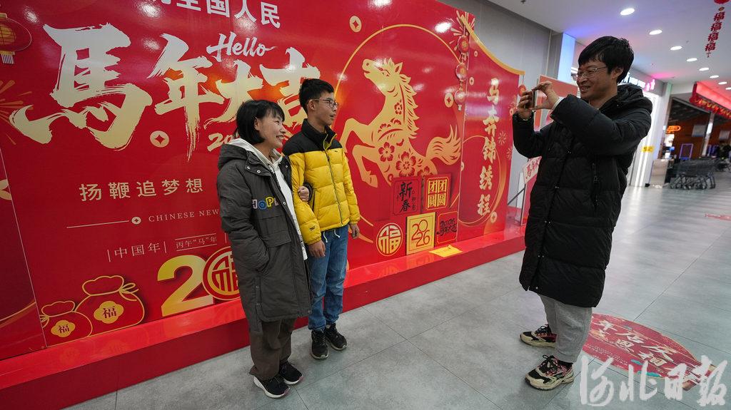 2月6日,窦则胜和家人在雄安奥特莱斯新年背景墙前拍照打卡。河北日报见习记者 李畅 摄