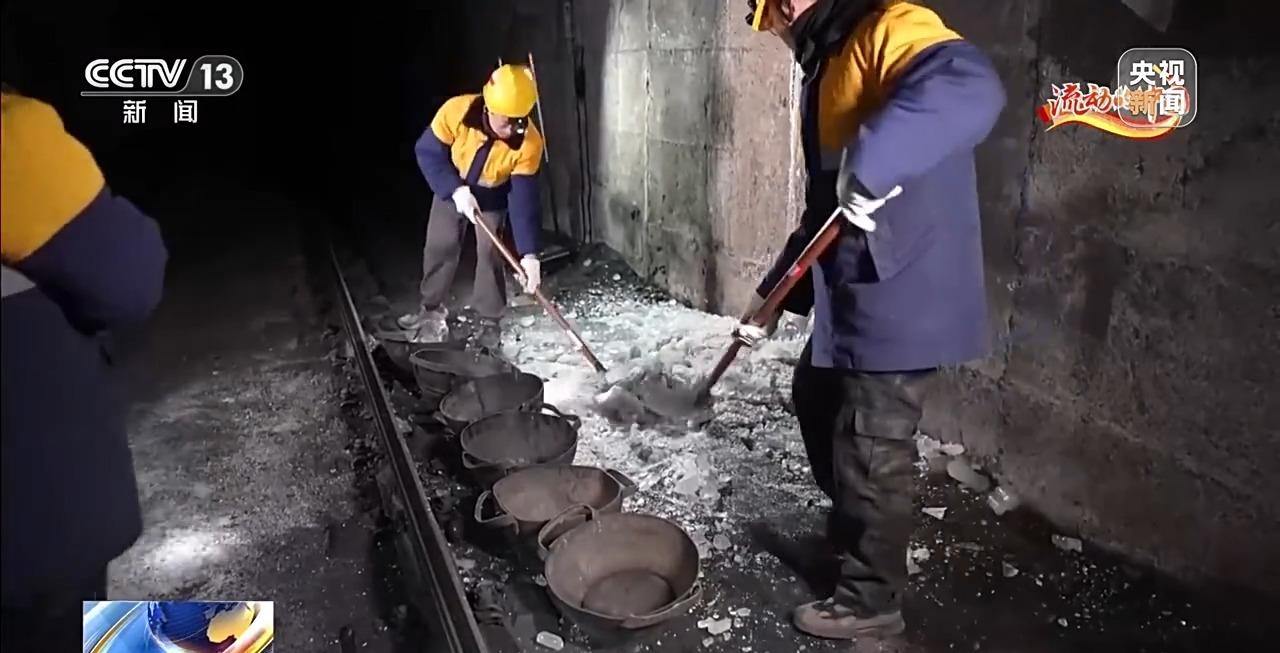 一连串除冰作业下来,队员们的脸上脖子里都是碎冰屑,队员们将碎冰装入皮斗,送出隧道。 将近两个小时的时间内,维修班组清除了十几处结冰点。