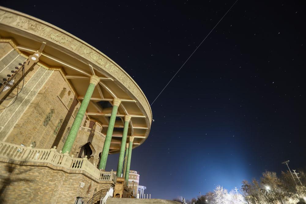 2022年12月28日,在新疆哈密拍摄的中国空间站飞过哈密木卡姆传承中心。新华社发(王俊峰 摄)