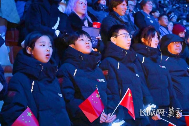观看速度滑冰男子5000米比赛时,孩子们身着虎头服,挥动国旗为中国队呐喊助威,可爱的模样吸引了众多外国友人目光。大家纷纷与孩子们合影,中国运动员也主动上前与孩子们打招呼,这一幕让他们印象深刻。