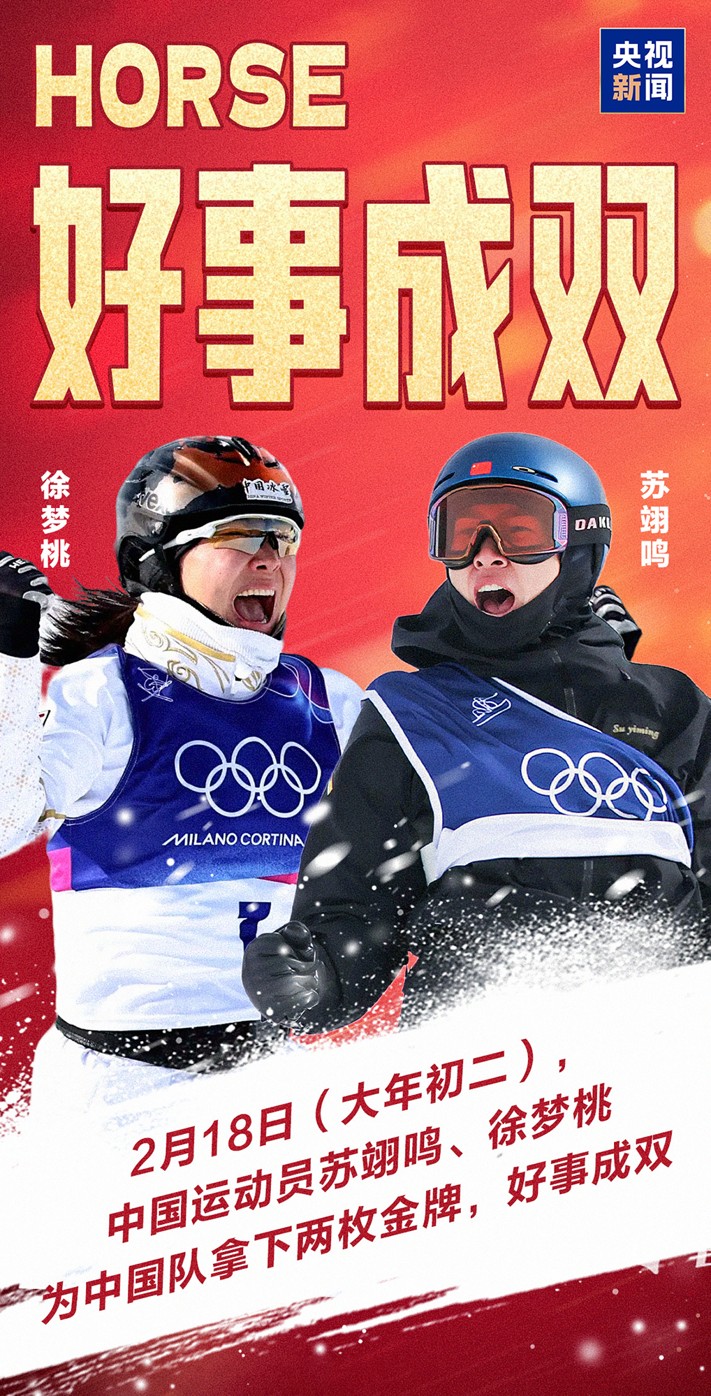 北京时间2月18日,在米兰-科尔蒂纳冬奥会上,中国选手苏翊鸣、徐梦桃分别夺得单板滑雪男子坡面障碍技巧、自由式滑雪女子空中技巧金牌。