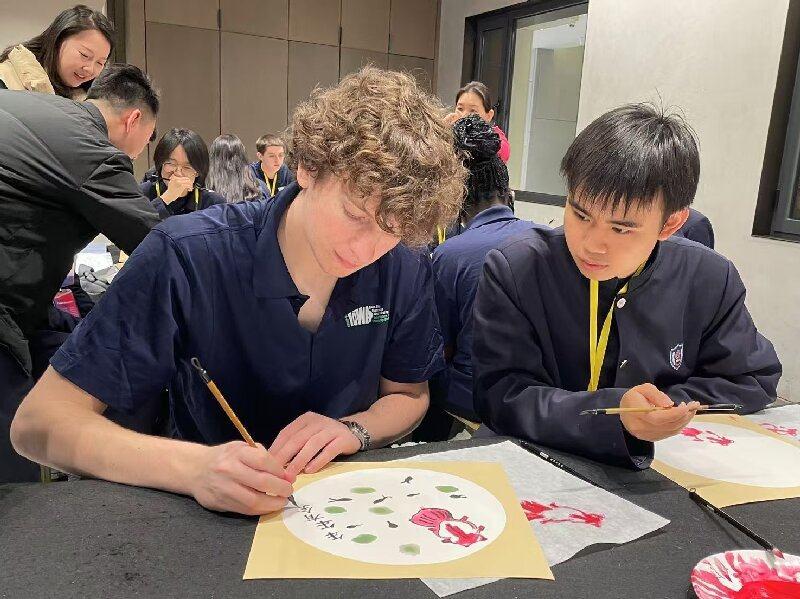 在中国传统文化特色体验课堂上,中美学生“一对一”结对制作的中国结,成为美国小伙伴心中的“网红爆款”;太极扇训练场里,美国小伙伴被中国功夫“圈粉”,他们挥扇生风,一招一式学得有模有样;书法和国画课堂中,中美学生在一撇一捺间感受汉字的结构之美,水墨丹青晕染出两国跨文化的艺术共鸣。体验完这些中国传统文化后,美国中学生连呼“Great”“Interesting”。