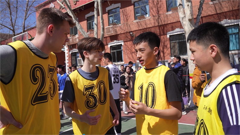 中美学生在体育联谊赛现场交流。