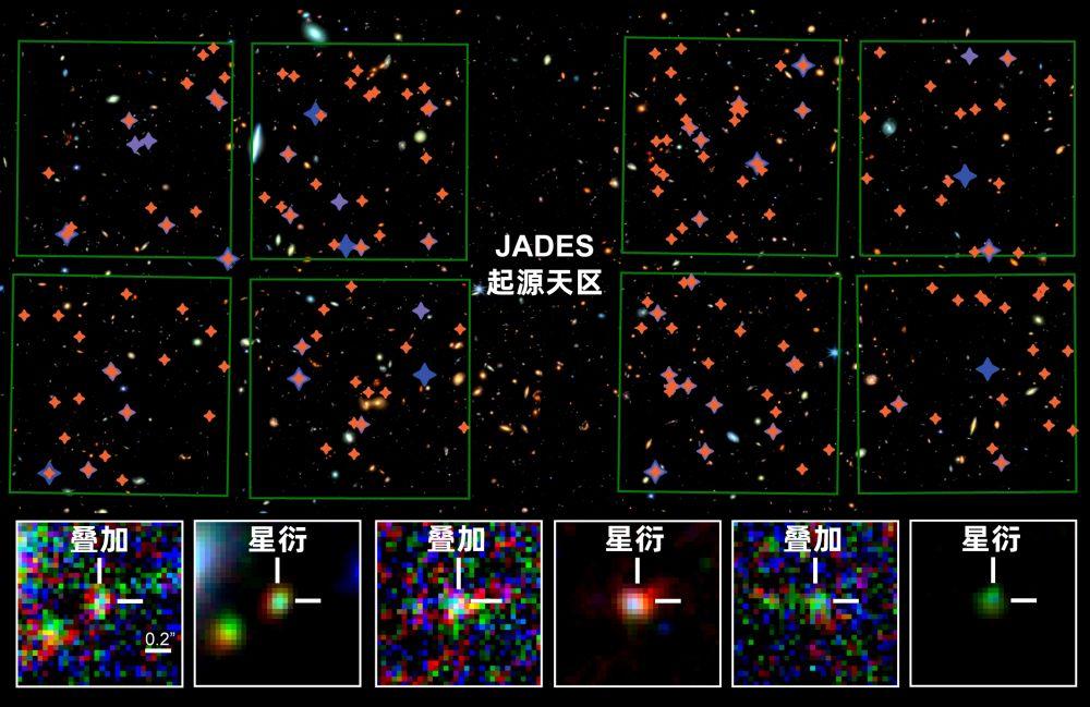 图为过往研究(蓝紫星标)与星衍(橙色星标)发现的候选星系效果对比图。(受访者供图)