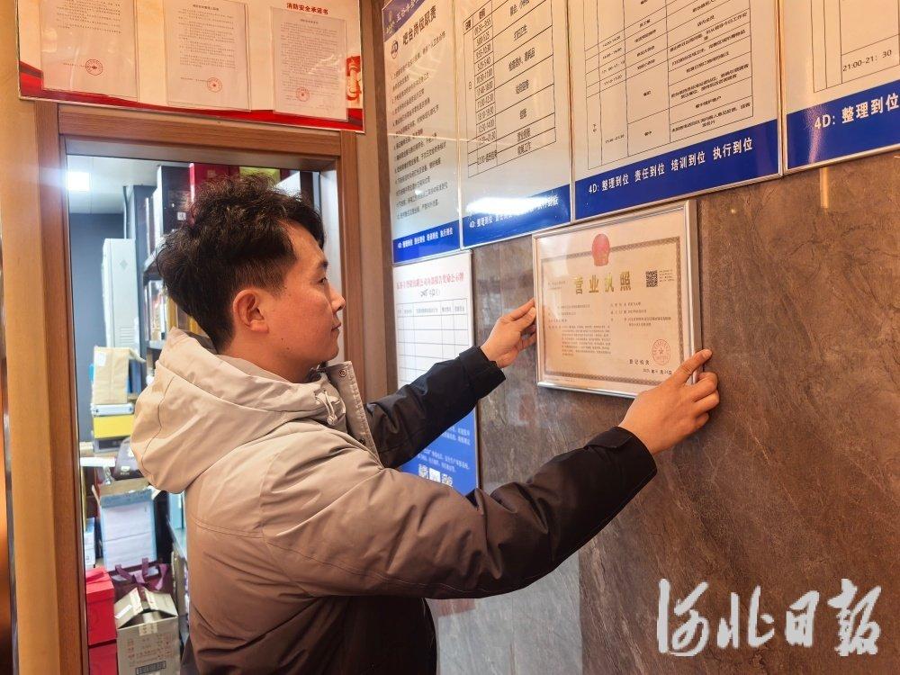 2月11日,“五谷丰登”餐饮店老板朱丽君正在摆放营业执照。河北日报记者 解楚楚 摄