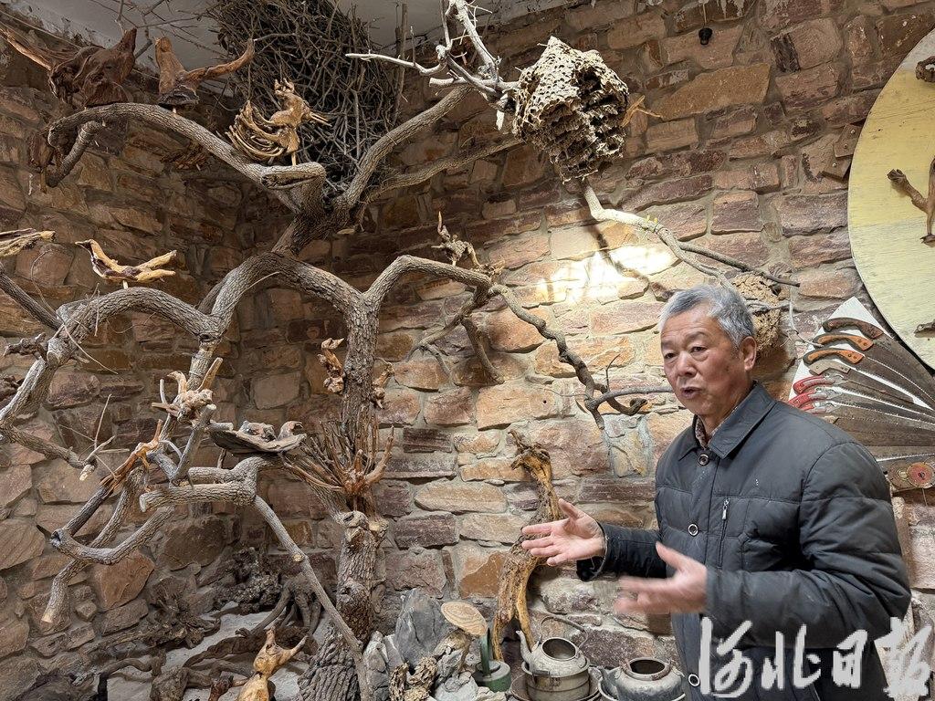 推开自制的石板门,400平方米的展馆俨然是个浓缩的大自然博物馆。根雕、石雕、植物标本、旧农具……琳琅满目的展品,让记者大饱眼福。“这种是卷柏,生长环境跟苔藓类似,只长在有一层薄土的石头上,三四年前才出现在山上;这种灌木叫小叶梣,在信都区很罕见,我们通过分根栽法才培育成功……”讲起每一件标本背后的故事,郭镇忠如数家珍,透着对山林草木的热爱。