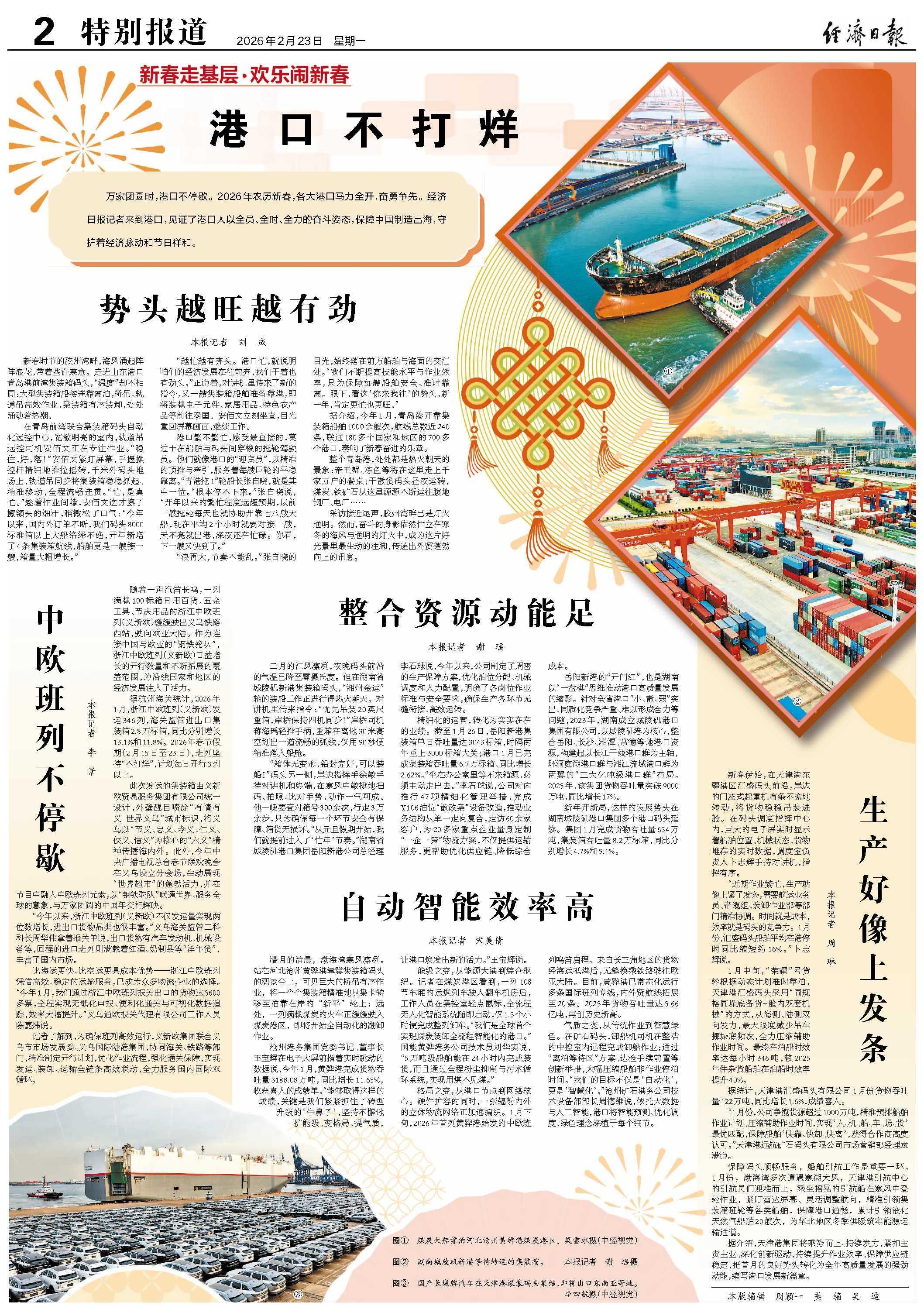 格局之变,从港口节点到网络核心。硬件扩容的同时,一张辐射内外的立体物流网络正加速编织。1月下旬,2026年首列黄骅港始发的中欧班列鸣笛启程。来自长三角地区的货物经海运抵港后,无缝换乘铁路驶往欧亚大陆。目前,黄骅港已常态化运行多条国际班列专线,内外贸航线拓展至20条。2025年货物吞吐量达3.66亿吨,再创历史新高。