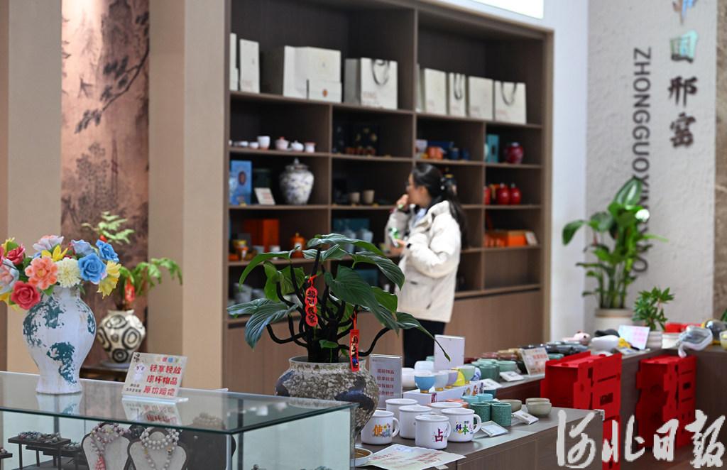 走进邢白瓷美学艺术馆一层展厅,类银似雪的邢白瓷经典器型整齐陈列,尽显千年瓷韵;鹦鹉杯、彩釉花瓶等现代创意作品,造型灵动、釉色斑斓,让传统瓷艺与现代审美相映成趣。