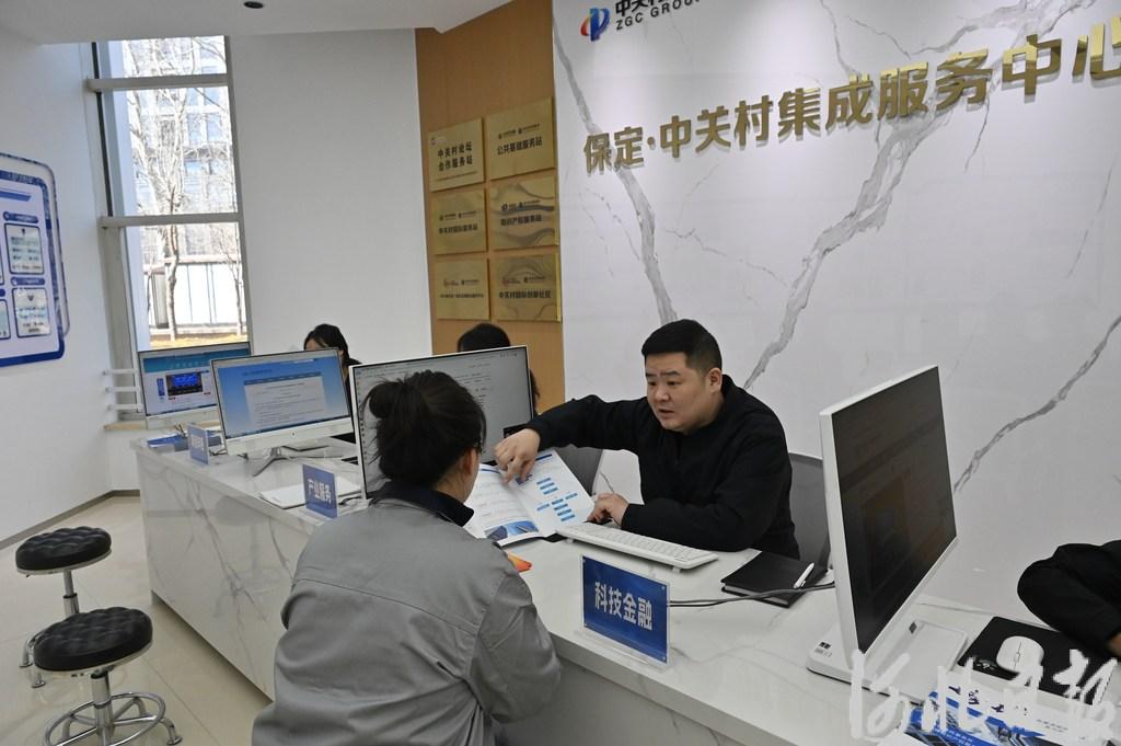 2月24日,在保定中关村创新中心的集成服务中心内,产业服务部经理刘浩(右一)在给企业办事人员介绍最新的惠企政策。河北日报见习记者李靖恬摄