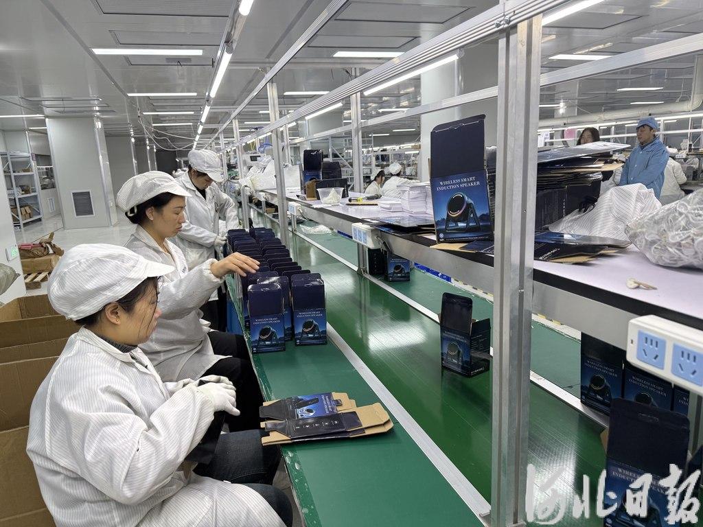 2月24日,邢台浩宁电子科技有限公司生产车间内,上百名员工正在有序组装两款蓝牙音响。“这是新研发的支架蓝牙音响,年初一上市就特别受欢迎。”该公司董事长李建立介绍,目前订单已经排到5月份了。