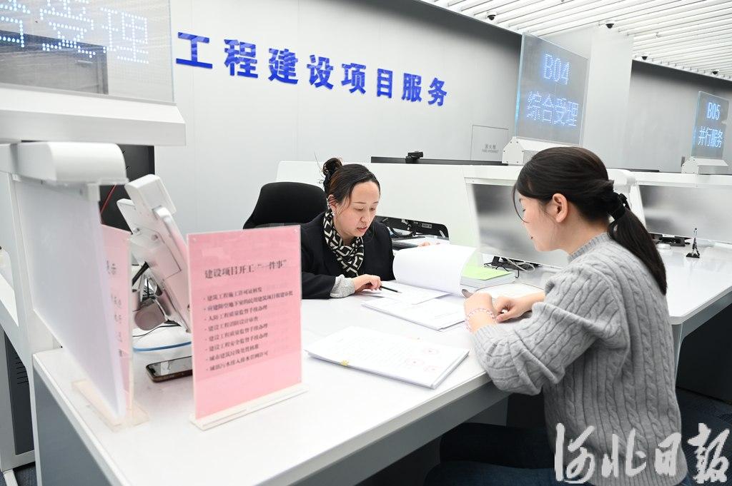 2月24日,石家庄市政务服务中心工程建设项目服务专区,张建英(右)在咨询相关业务如何办理。河北日报记者张晓超摄