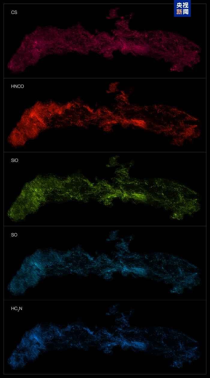 △ALMA观测到的银河系中心不同分子分布:ACES已绘制出银河系中心数十种分子的空间分布。此处展示的五种分子自上而下分别为:一硫化碳、异氰酸、一氧化硅、一氧化硫和氰乙炔。