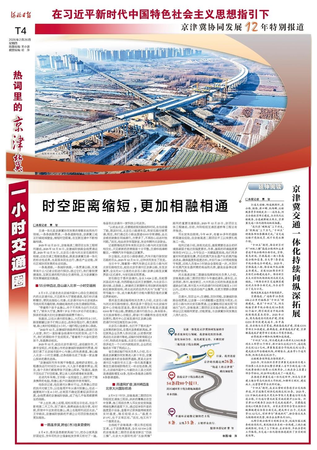 交通兴,则百业兴;交通畅,则协同畅。京唐城际铁路全线贯通,让京唐一小时通勤圈从蓝图变为现实。北京石小路与河北安石路贯通,让京冀毗邻区域实现“同城化”出行。京雄高速二期项目正在稳步推进,通车后将会让区域路网更密、功能更强,为京津冀协同发展注入持久动力。(河北日报记者 曹智)