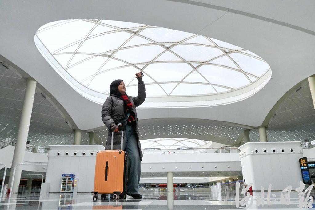 2月6日,旅客在北京通州站候车大厅拍照留念。河北日报记者 王伟 摄