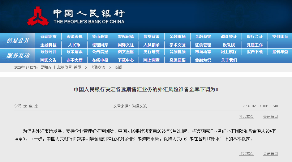 为促进外汇市场发展,支持企业管理好汇率风险,中国人民银行决定自2026年3月2日起,将远期售汇业务的外汇风险准备金率从20%下调至0。下一步,中国人民银行将继续引导金融机构优化对企业汇率避险服务,保持人民币汇率在合理均衡水平上的基本稳定。
