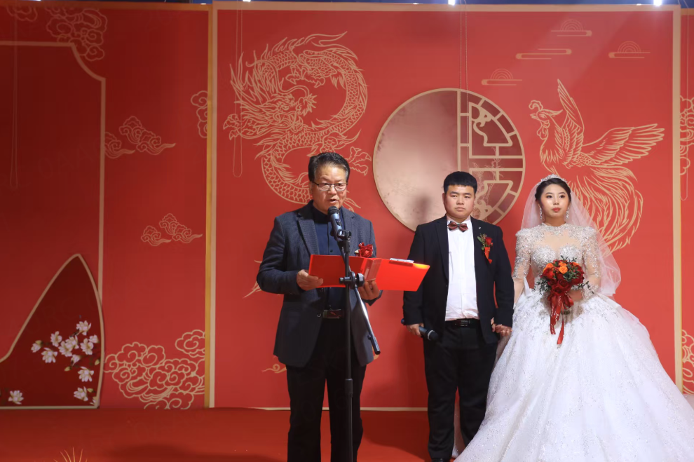 在河间市兴村镇大庄村举办的一场集体婚礼上,石炳启代表(左一)为新人证婚。(资料片)石炳启 供图