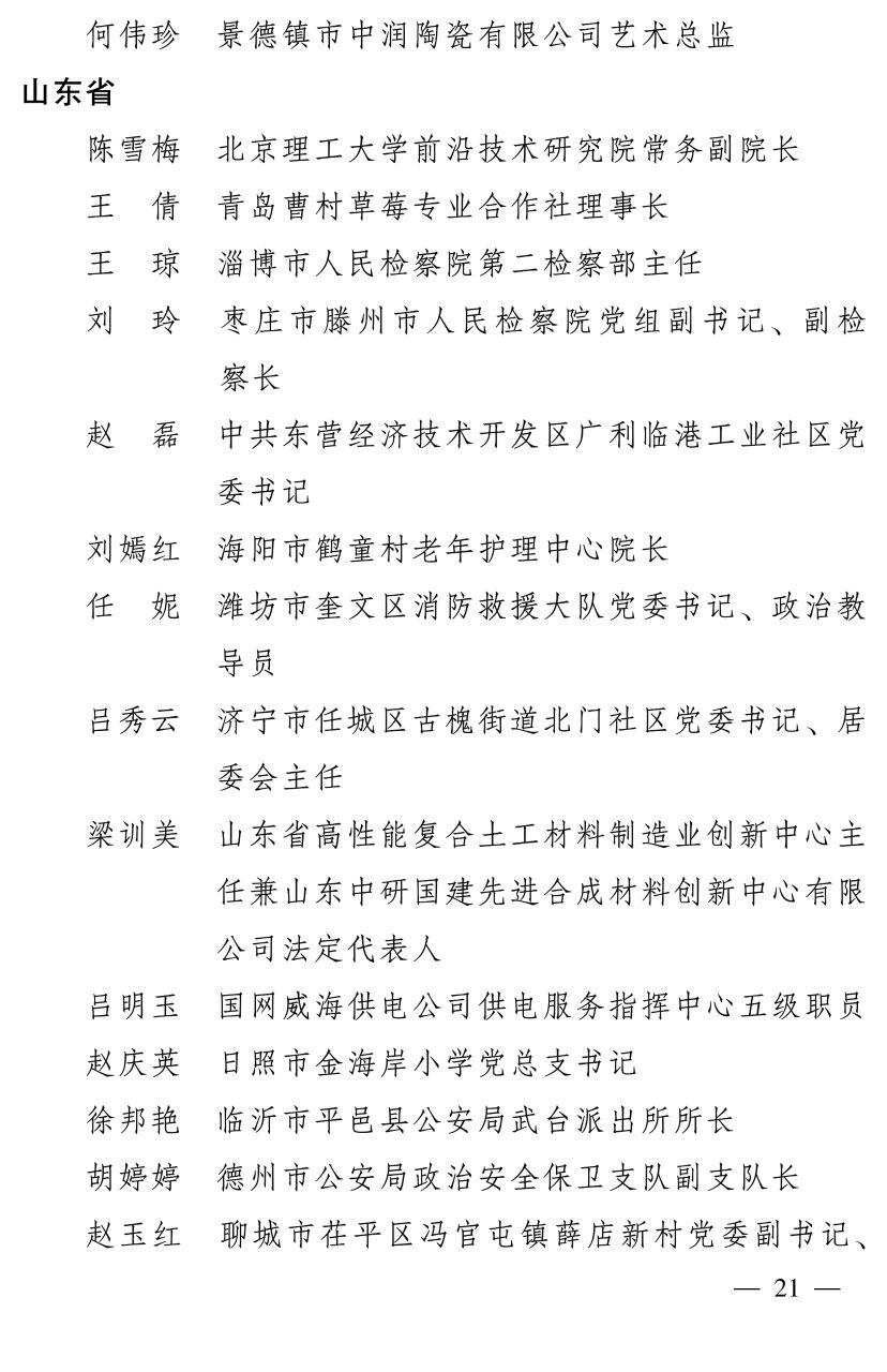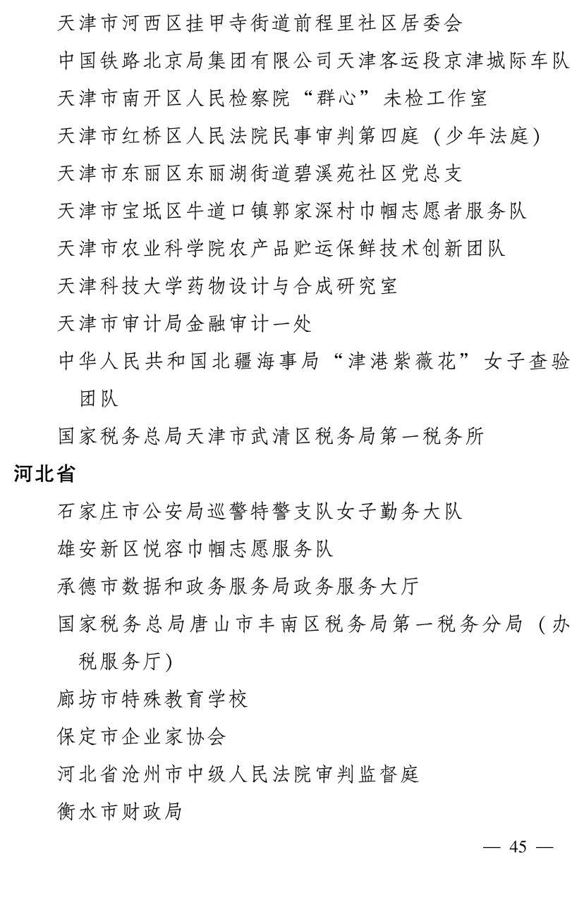 河北省获表彰名单中,曹敏等21人被授予全国三八红旗手称号,石家庄市公安局巡警特警支队女子勤务大队等12个集体被授予全国三八红旗集体称号,石家庄市12345政务服务便民热线等23个单位被授予全国巾帼文明岗称号。
