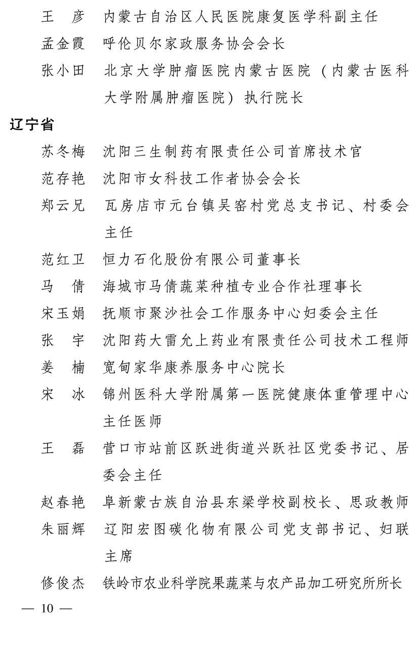 全国妇联决定,授予兰臻等9人全国三八红旗手标兵称号,授予阮祥燕等598人全国三八红旗手称号,授予中国人民抗日战争纪念馆社会教育部等400个单位全国三八红旗集体称号,授予首都医科大学附属北京同仁医院耳鼻咽喉头颈外科等600个单位全国巾帼文明岗称号。