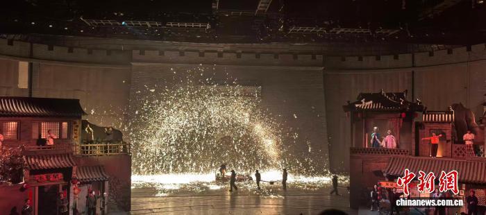 春节假期期间,蔚县大型实景演出《燕云十六州之梦回蔚州》结尾表演的国家级非遗打树花。中新社记者 安英昭 摄