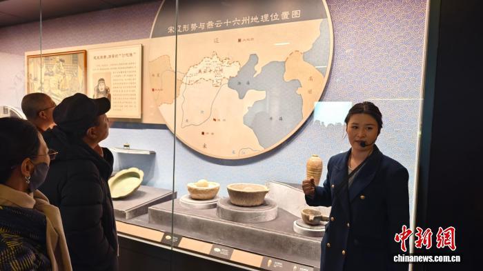 春节假期期间,蔚县博物馆宣教部讲解员郭泠杰(右一)向参观者介绍馆藏文物。中新社记者 安英昭 摄