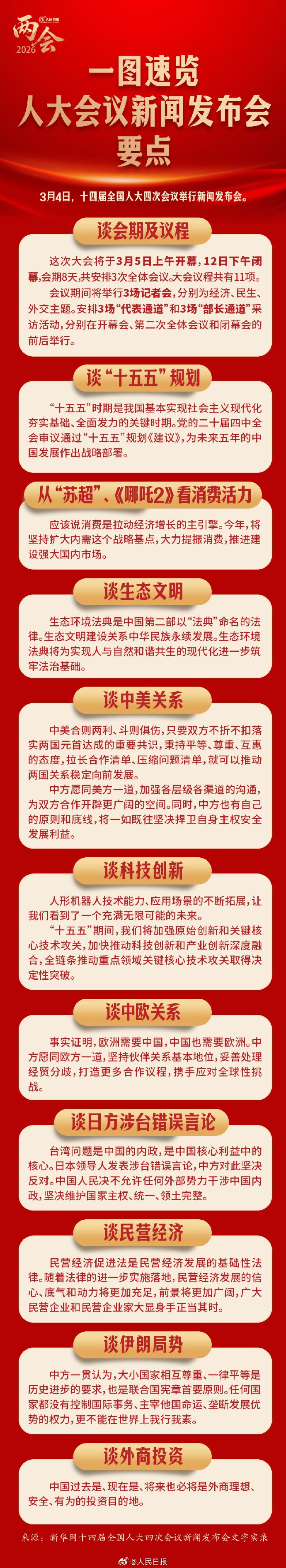 3月4日,十四届全国人大四次会议举行新闻发布会。从苏超、《哪吒2》到人形机器人,从回应中美关系到日方涉台错误言论……人大会议新闻发布会说了啥?一图速览人大会议新闻发布会要点↓↓