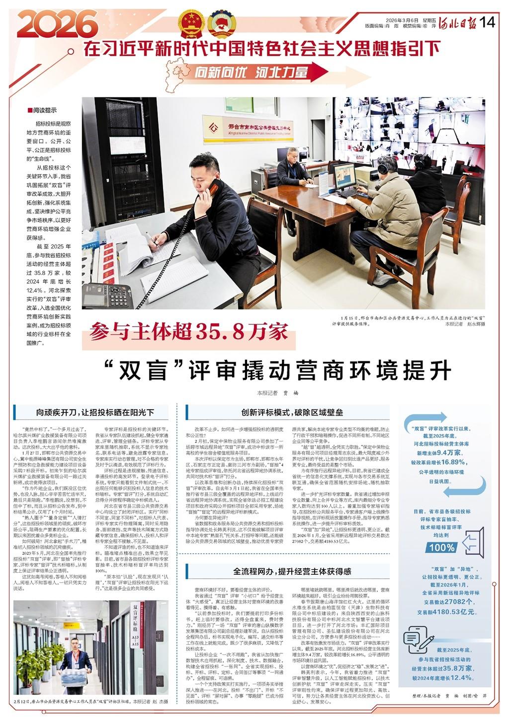 截至2025年底,参与我省招投标活动的经营主体超过35.8万家,较2024年底增长12.4%。河北探索实行的“双盲”评审改革,入选全国优化营商环境创新实践案例,成为招投标领域的行业标杆在全国推广。
