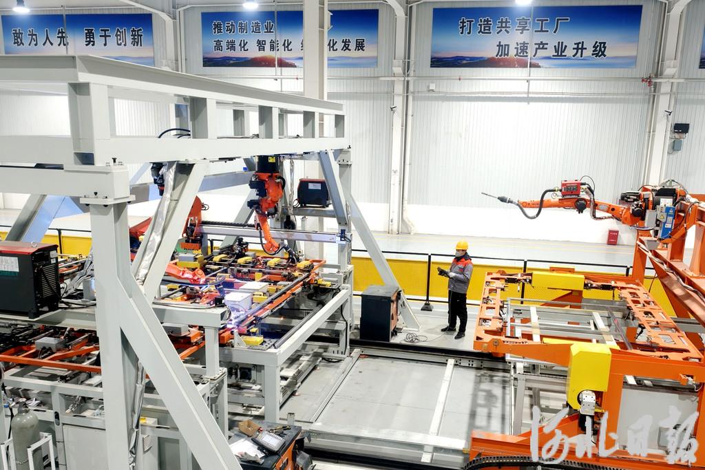 1月28日,安平县共享智造工厂,工作人员操作自动化焊接设备生产护栏网。河北日报记者 焦磊 摄