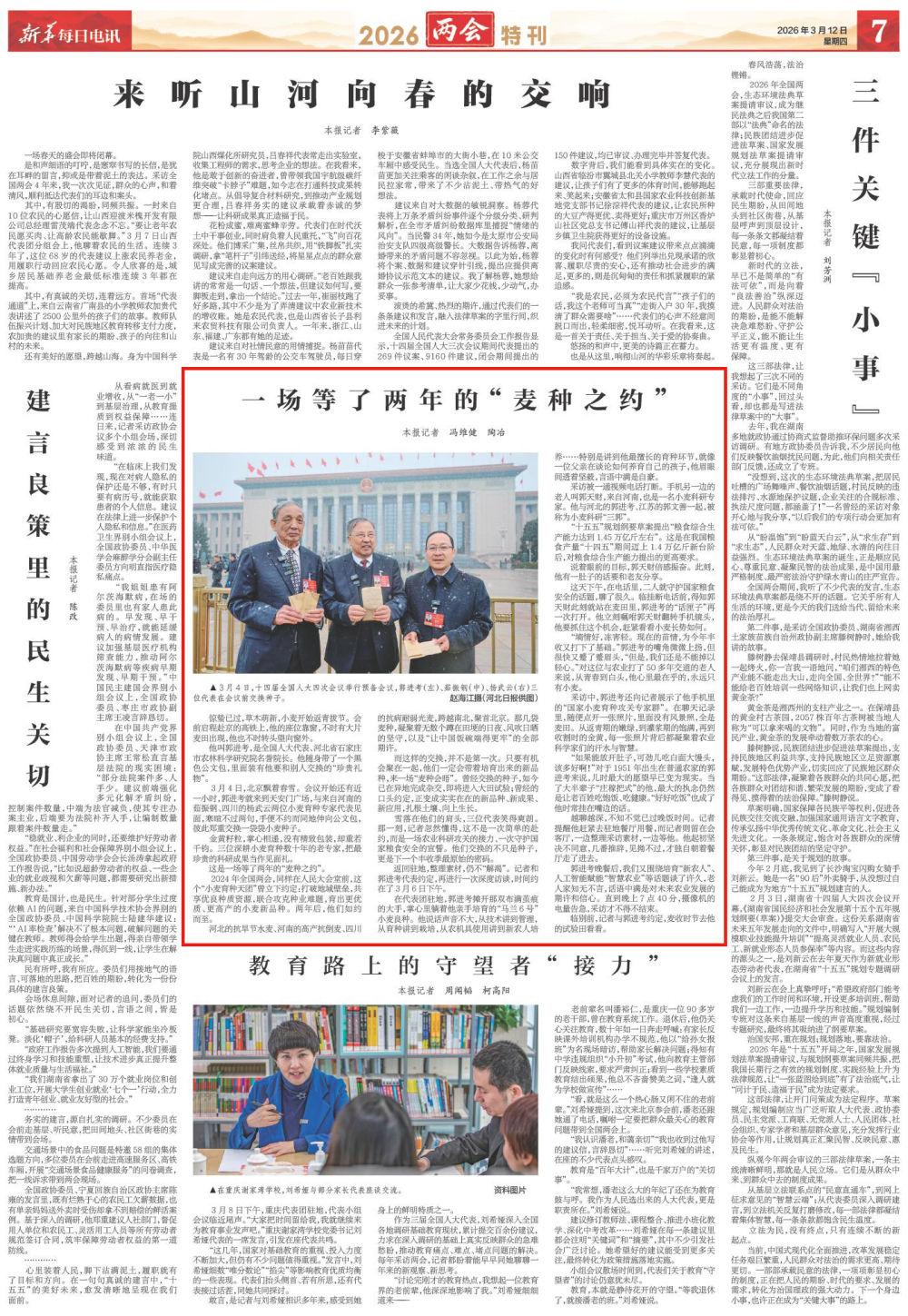2024年全国两会,同样在人民大会堂前,这个“小麦育种天团”曾立下约定:打破地域壁垒,共享优良种质资源,联合攻克种业难题,育出更优质、更高产的小麦新品种。两年后,他们如约而至。