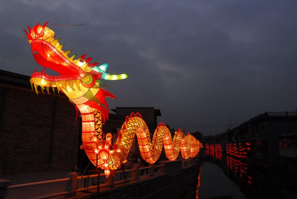 水与火,在古镇交融交织;荷与灯,在河上竞相绽放。