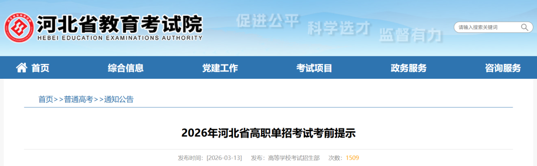 2026年河北省普通高等职业教育单独考试招生(简称高职单招)考试将于3月21日进行,现将有关事项提示如下: