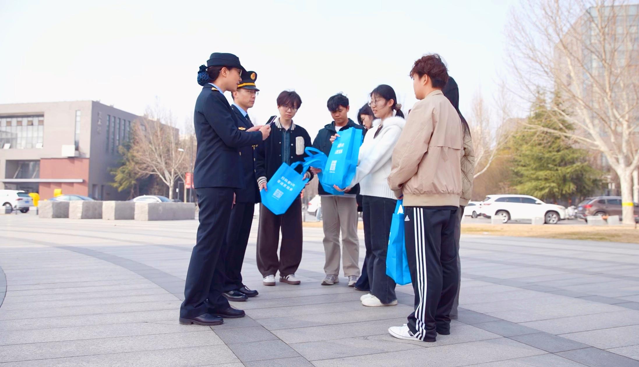 执法人员邀请同学们参与“扫一扫”VR普法互动体验。