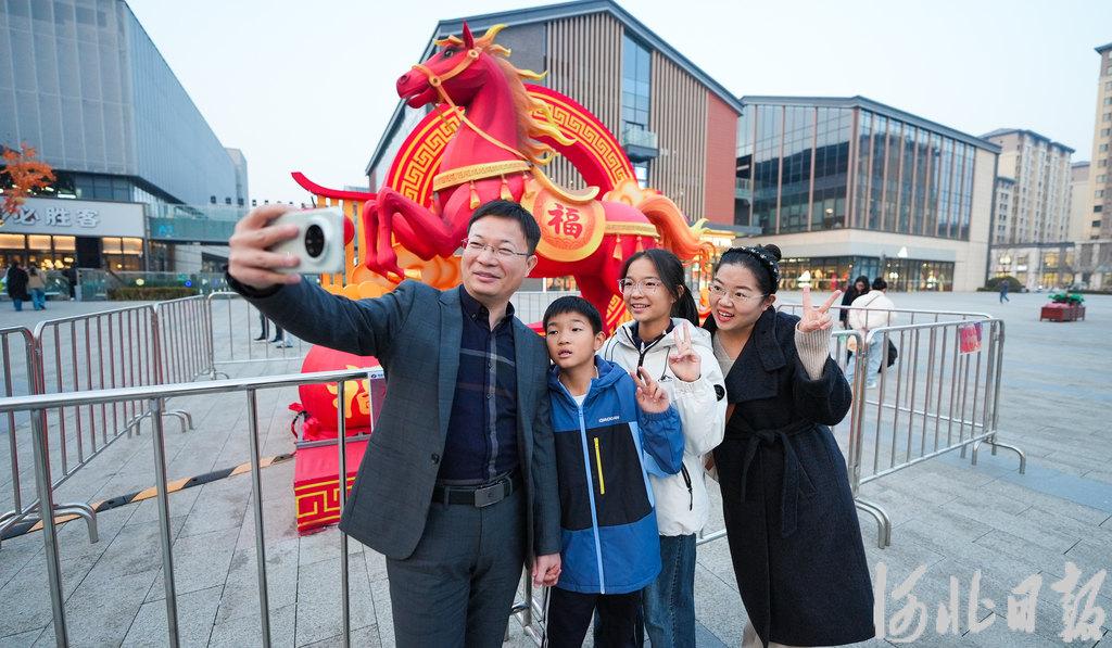 3月10日傍晚,雄安奥特莱斯北区南广场,巩文通一家四口打卡拍照。 河北日报见习记者 李畅 摄