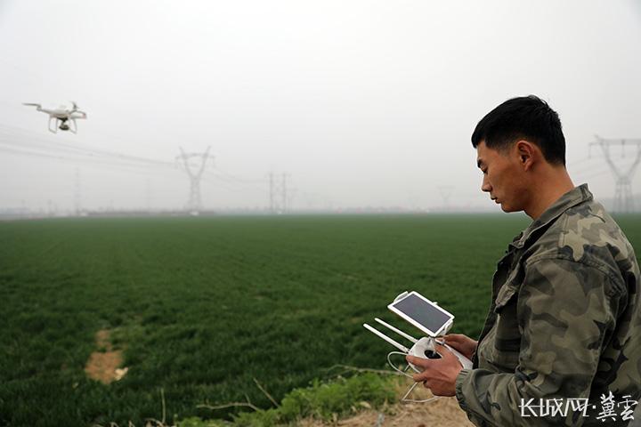 北京爱科农科技有限公司驻定兴农场负责人阎志敏正在用无人机监测麦田长势。长城网·冀云客户端记者 李佳琦 摄