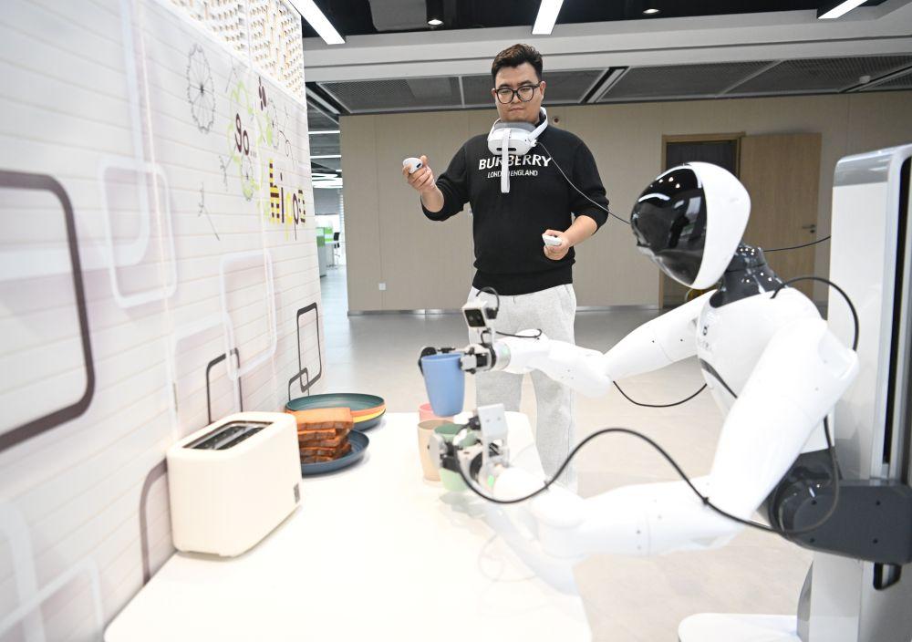 ↑3月17日,在中国雄安集团数字城市科技有限公司具身智能训练场,工作人员采集机器人训练数据。