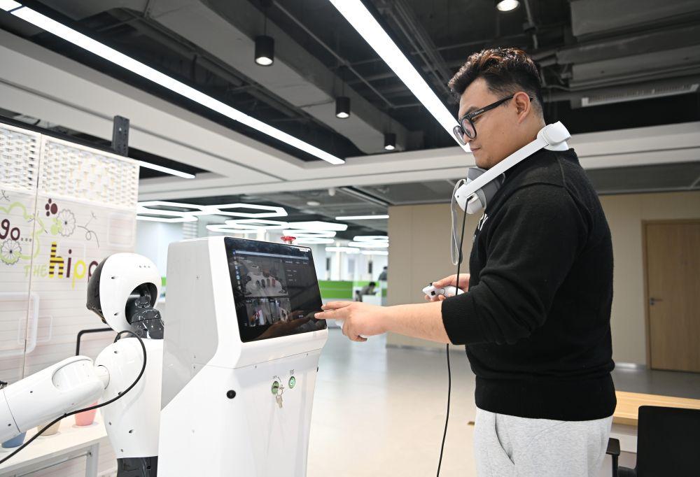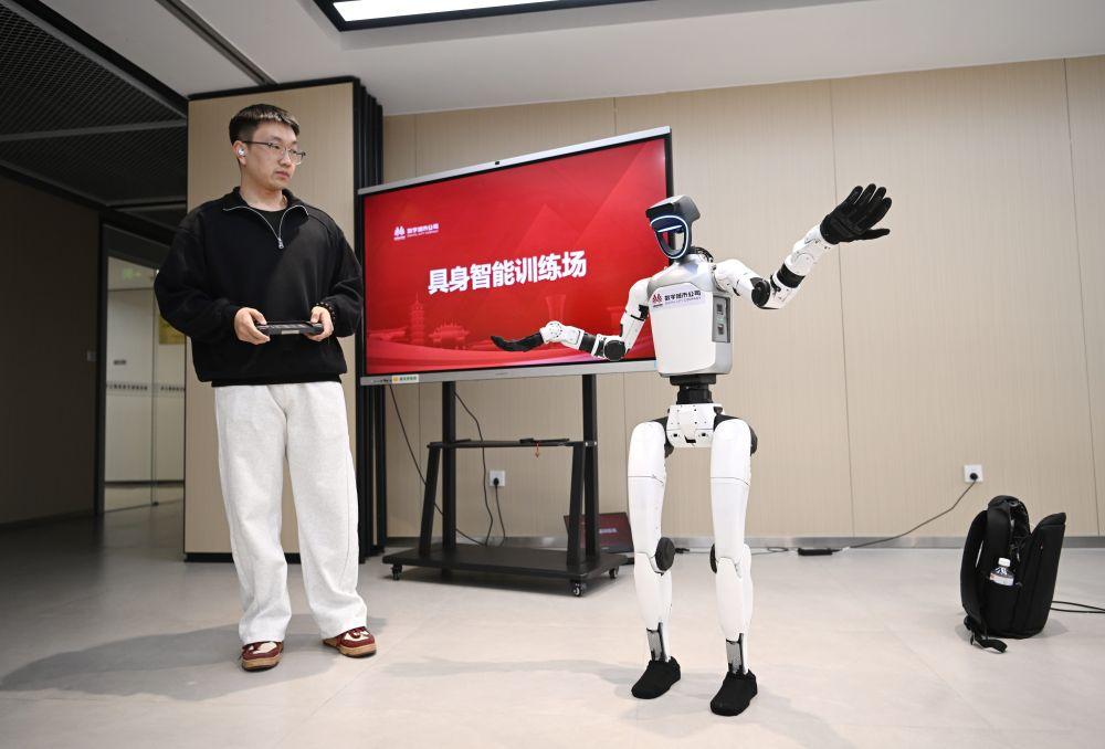 ↑3月17日,在中国雄安集团数字城市科技有限公司具身智能训练场,工作人员对机器人进行调试。
