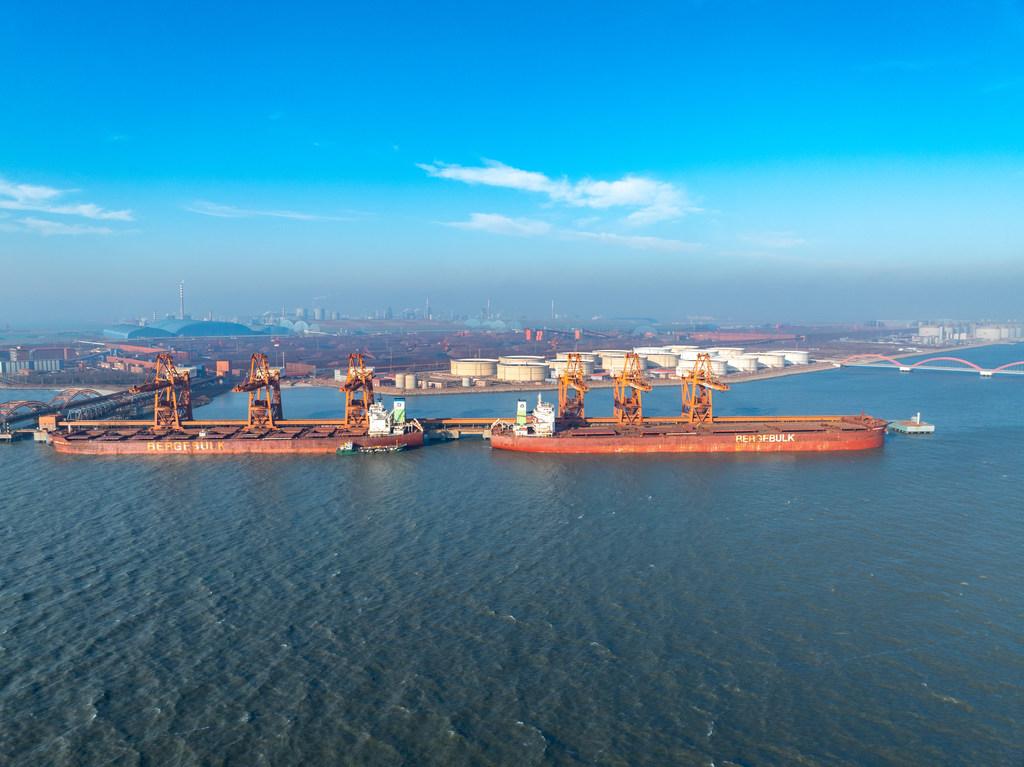 近日,在唐山港曹妃甸港区矿石码头,货船在装卸作业。杨杨 摄