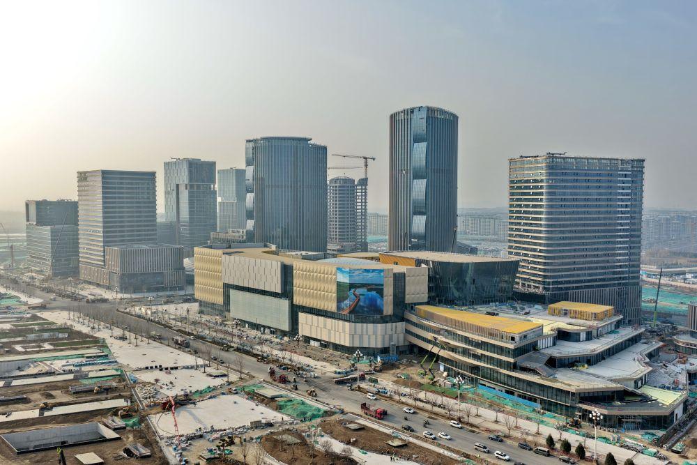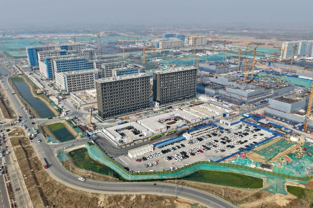↑ 雄安新区启动区国贸中心项目建设现场(3月25日摄,无人机照片)。