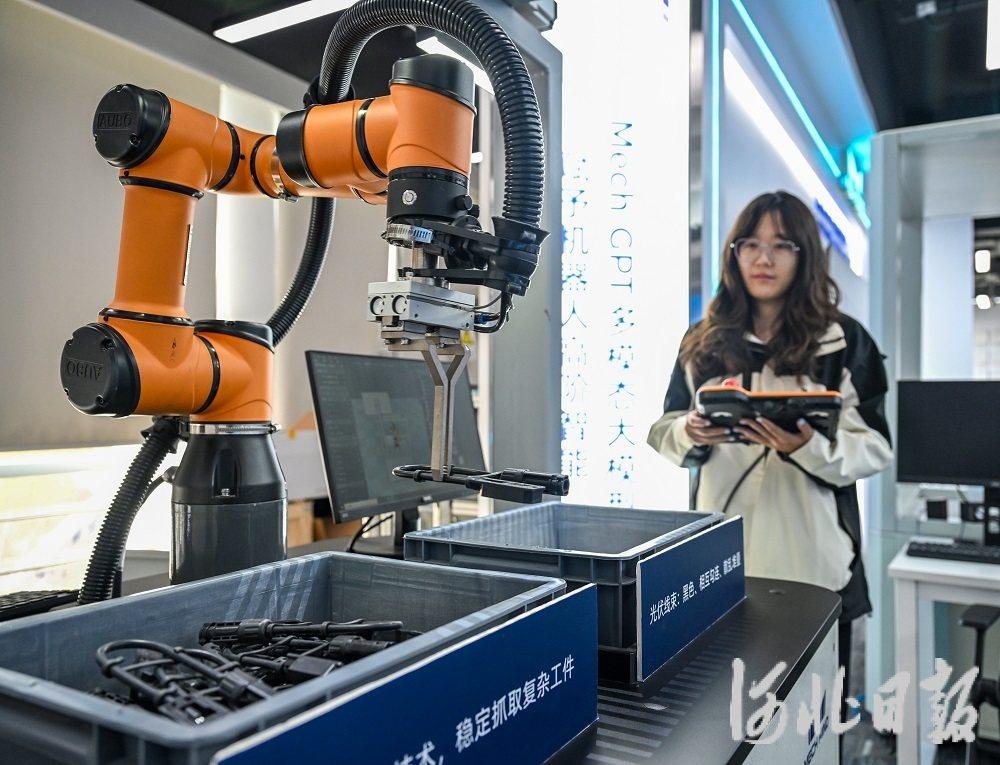 近日,雄安新区中关村科技园内,一企业员工正在操控工业机器人。河北日报记者 李东宇 摄