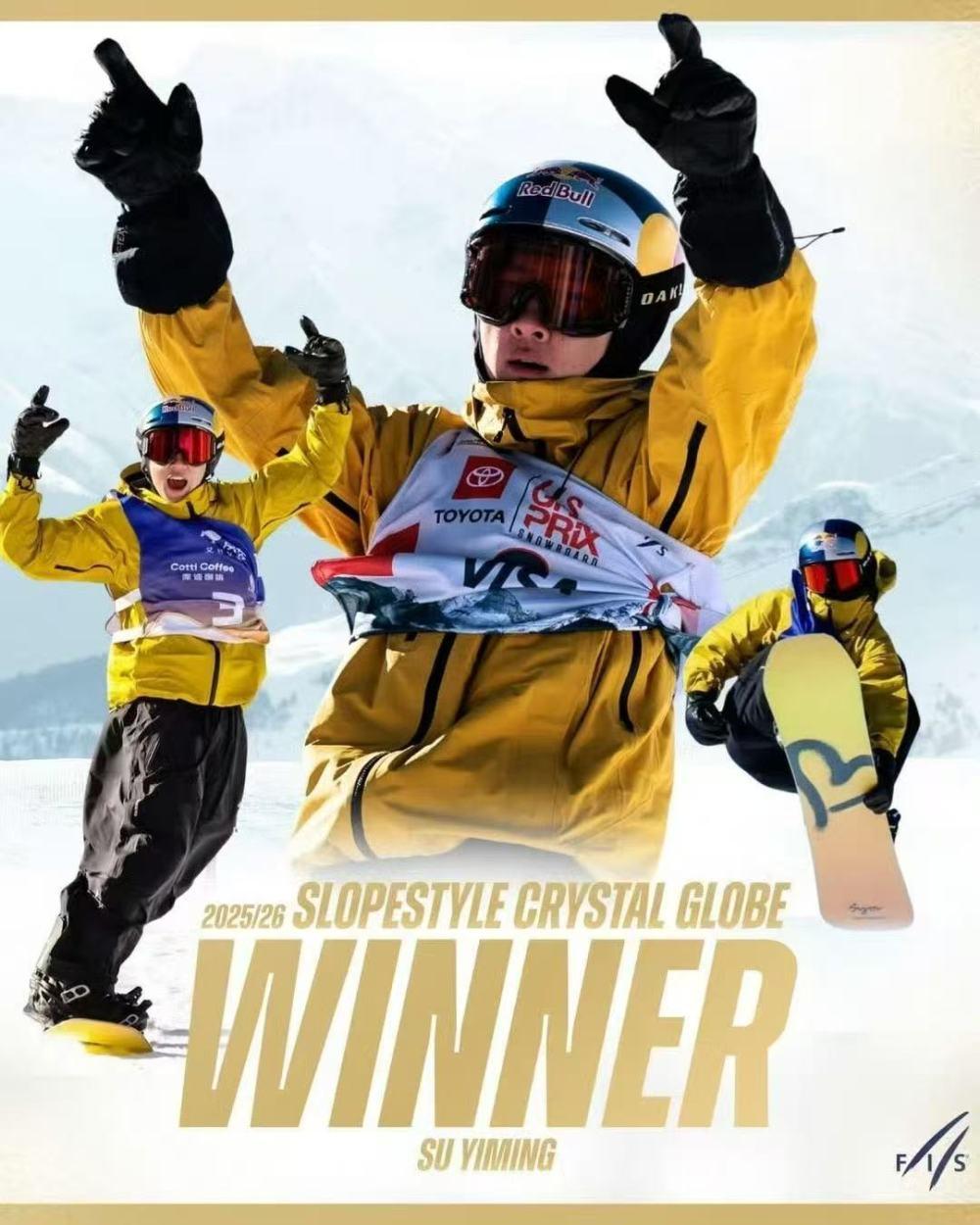 图为国际雪联发布的祝贺苏翊鸣夺得坡障世界杯男子赛季总冠军海报