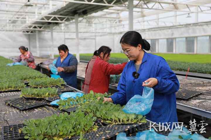 沧州市肃宁县绿苑蔬菜专业合作社负责人张莎莎(右)与工人一起装苗。长城网·冀云客户端记者 李佳琦 摄