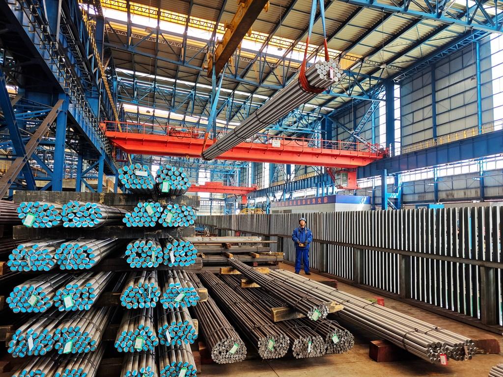 3月11日,河钢集团石钢公司成品车间,工人正在吊运绿钢棒材。 本报记者 周聪聪摄