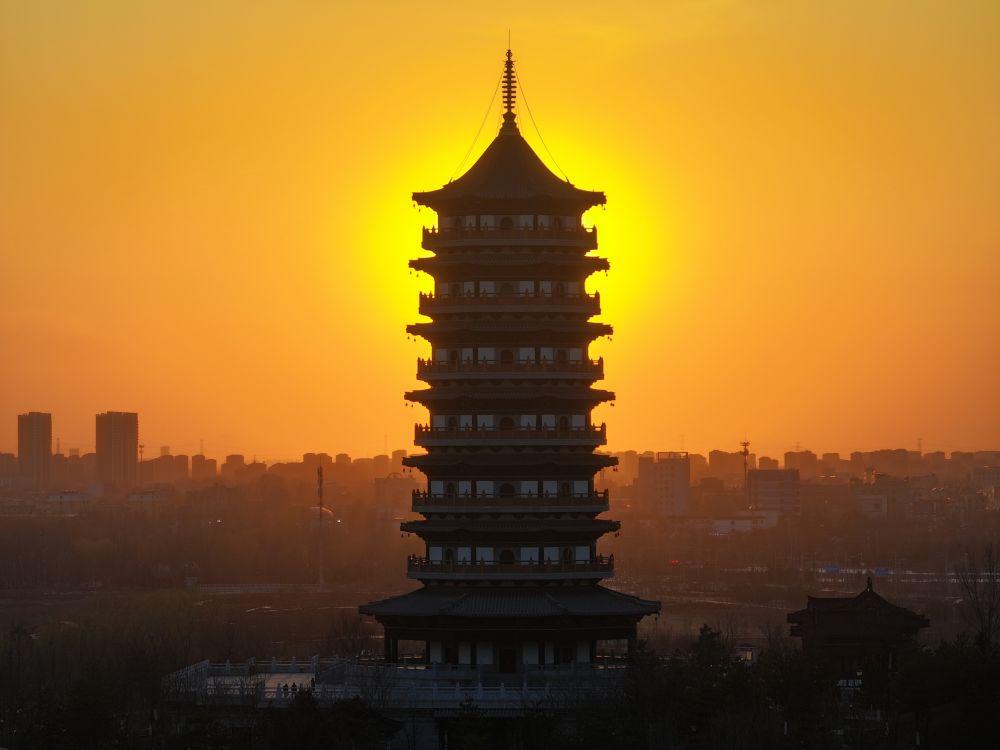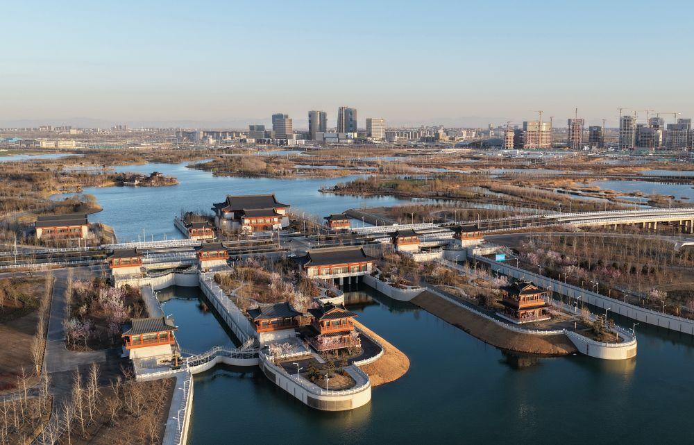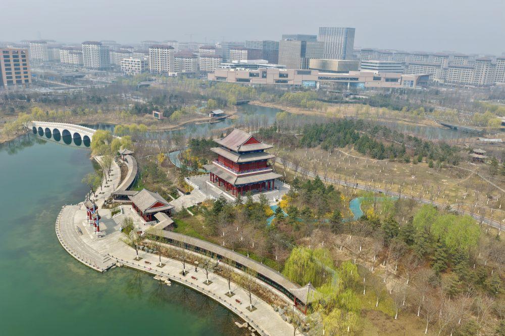 ↑ 这是雄安新区悦容公园安和塔(3月18日摄,无人机照片)。新华社记者 朱旭东 摄