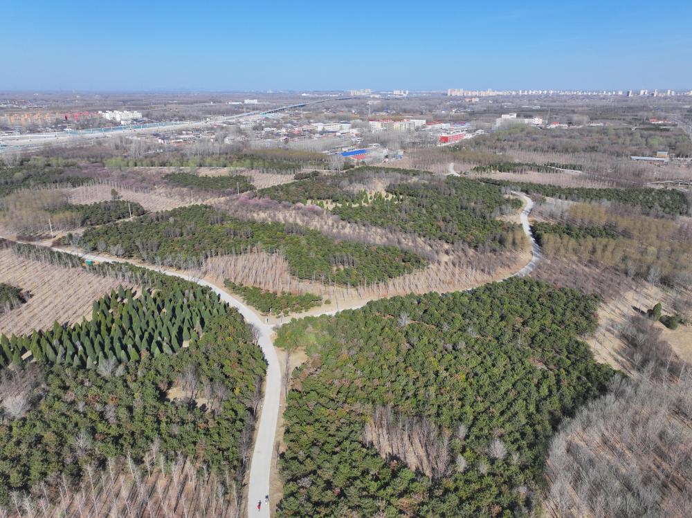 ↑ 雄安新区“千年秀林”春意萌发(3月18日摄,无人机照片)。新华社记者 朱旭东 摄