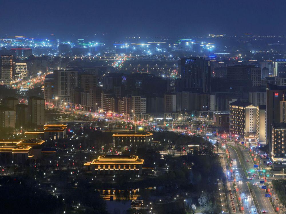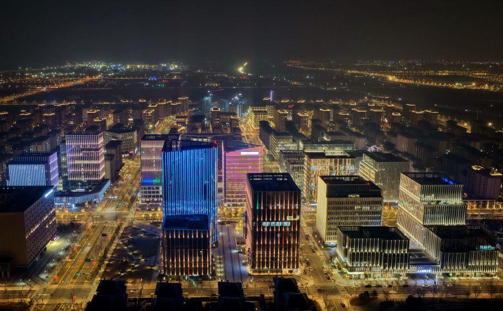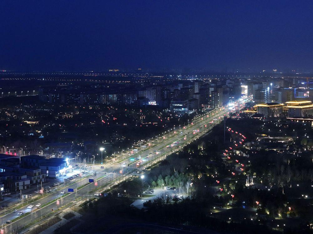 ↑ 雄安新区商务服务中心片区夜景(3月16日摄,无人机照片)。新华社记者 杨世尧 摄