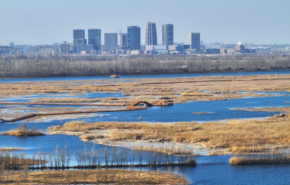 ↑ 这是雄安新区白洋淀及远处的启动区(3月18日摄,无人机照片)。新华社记者 朱旭东 摄