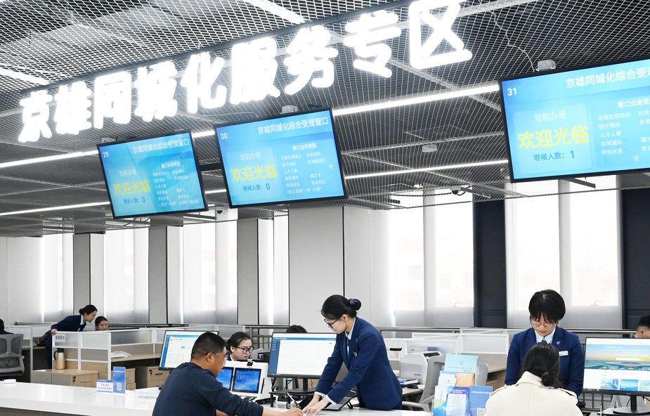在雄安新区政务服务中心京雄同城化服务专区,工作人员为办事人员提供服务。