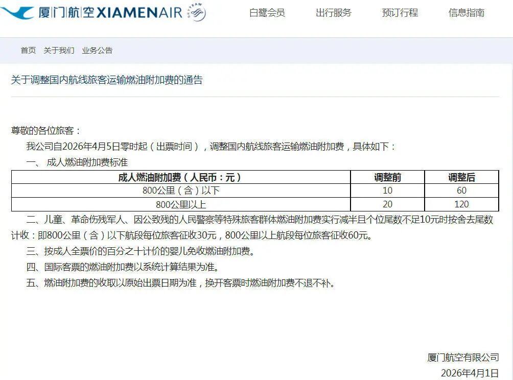 4月1日,国航、厦航、中联航等多家航司发布公告,调整国内航线旅客运输燃油附加费收取标准。